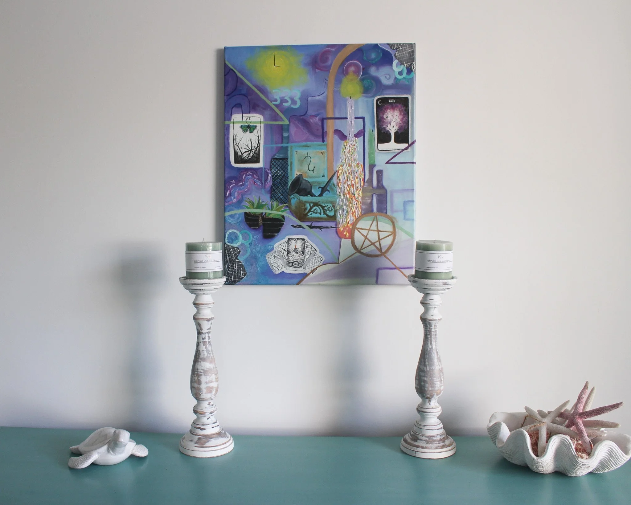 This is a still life oil painting that combines cubism and expressionism. This painting displays my spirituality and beliefs in energy, vibrations, witchcraft and the universe. Symbols in this painting include, tarot cards, angel numbers and the elements. The colours are ones that I relate spirituality to and the objects used are part of my room. This painting originated from my own still life reference photographs, then adding in my sketch cubism and expressionism. This painting also has texture added specifically on the wax dripped candle glass bottle and within the background.